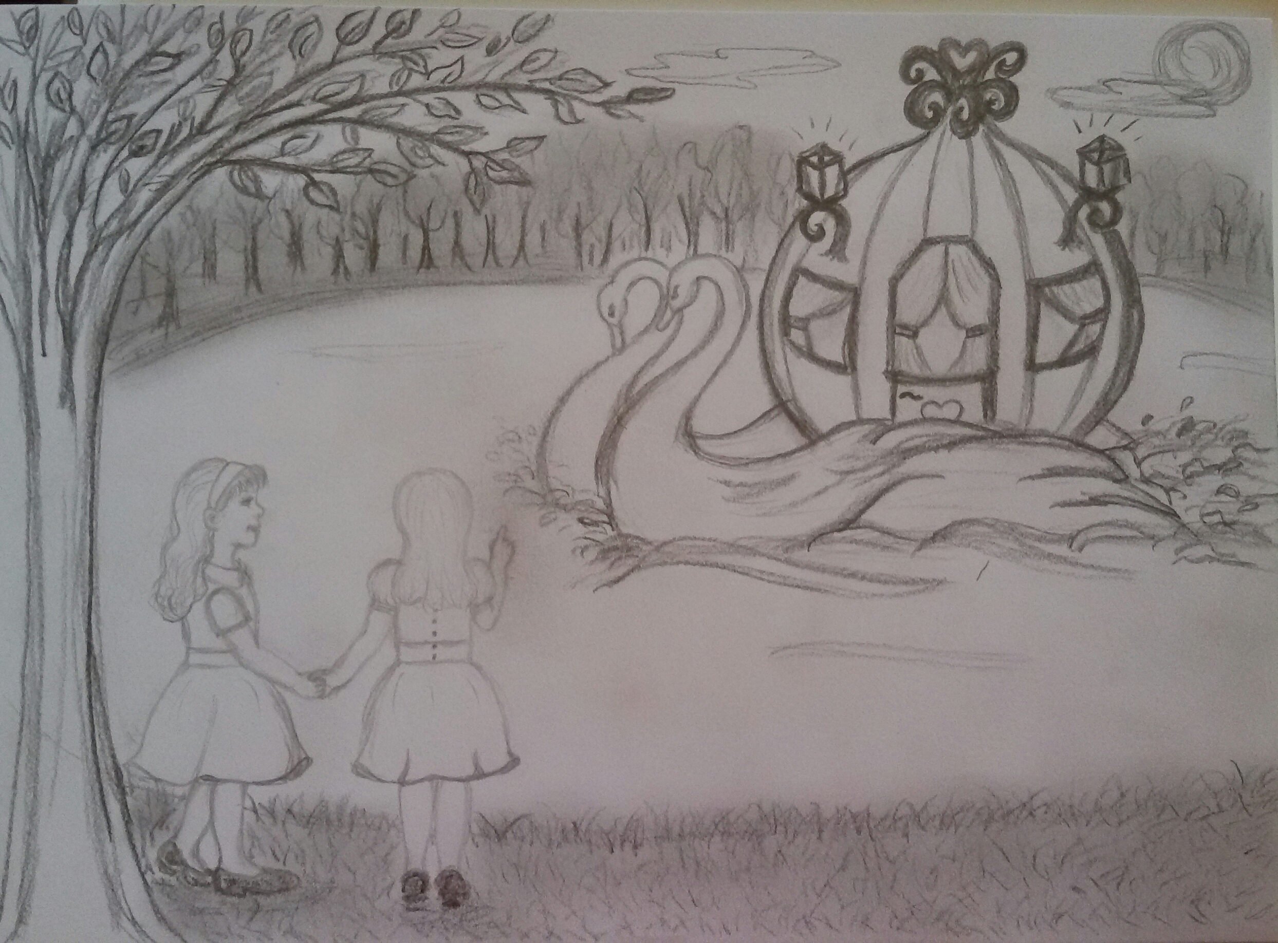 E così i due cigni trainarono la carrozza a forma di barca fino alla riva e salutarono le due bambine che al settimo cielo ringraziarono i cigni e iniziarono a correre felici nel bosco.